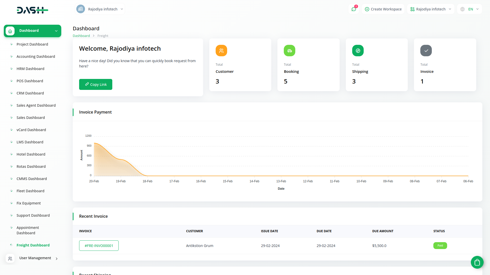 Gain unparalleled insights into your logistics operations with the comprehensive dashboard provided by Dash SaaS Freight Management Integration. This intuitive dashboard serves as your command center, presenting key metrics such as total customers, bookings, shipping, and invoices in a visually engaging and easy-to-understand format. Moreover, you can effortlessly monitor recent invoices and shipping lists, ensuring that you have real-time visibility into the performance of your logistics processes and the status of your shipments.