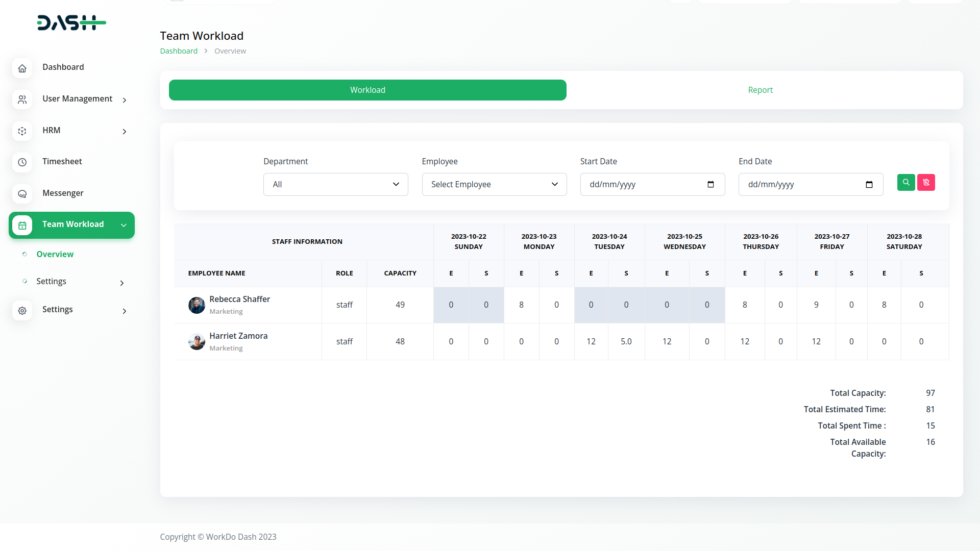 With the Team Workload module, we can find out the total number of hours an employee has the ability to work in a week and the total number of hours worked in these occupations.